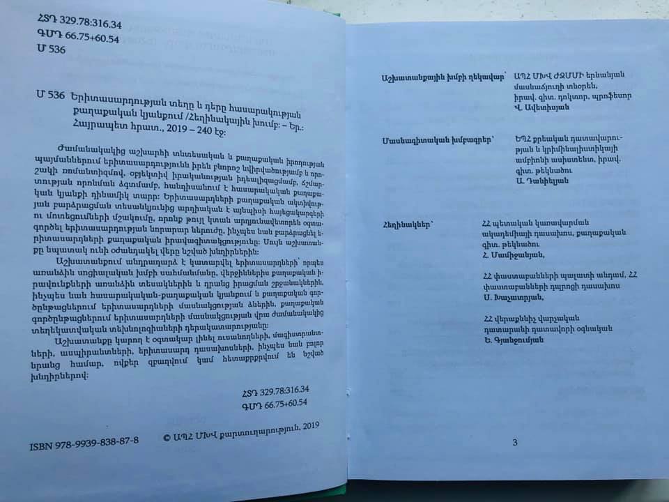 Ереванский филиал МИМРД МПА СНГ представляет вниманию читателей электронную версию нового исследования "Место и роль молодежи в политической жизни общества", проведенного осенью этого года. Исследование опубликовано на армянском и русском языках.